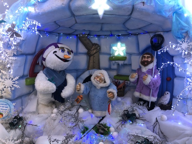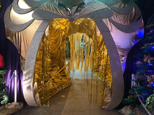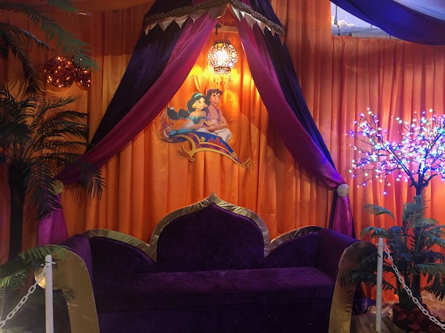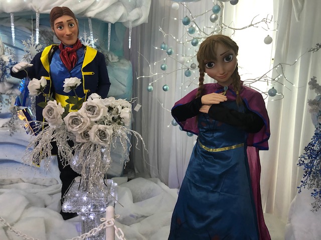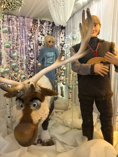 We were greeted by singing reindeer heads then entered a room with fairly traditional decorations – a tree, snowmen and so on, with displays like a traditional toy shop window. But that’s where the traditional decorations ended – next we entered an opulent Aladdin’s cave with plush velvet furnishings, images from the Disney Aladdin’s film, an animatronic camel that told jokes, and more. There was a woodland scene with (I think) characters from the Wind in the Willows, the Owl and the Pussycat in their little row boat, some animatronic beavers, Aslan from the Chronicles of Narnia, a giant unicorn and giant polar bear (actually that may have been lifesize, they are pretty big!). Then a real crowd-pleaser – Olaf from Frozen alongside Anna, Elsa, Christoff and Sven – Sven was moving as well. More music awaited around the next corner with a barbershop quartet of singing penguins – I could have watched them for ages!
