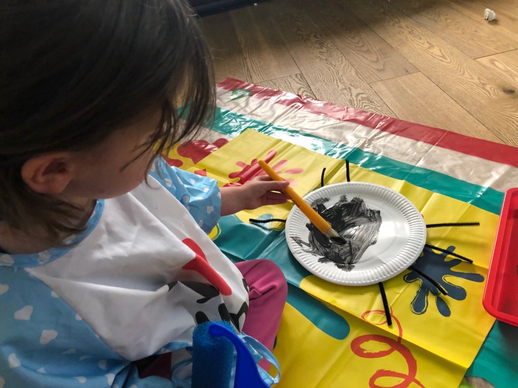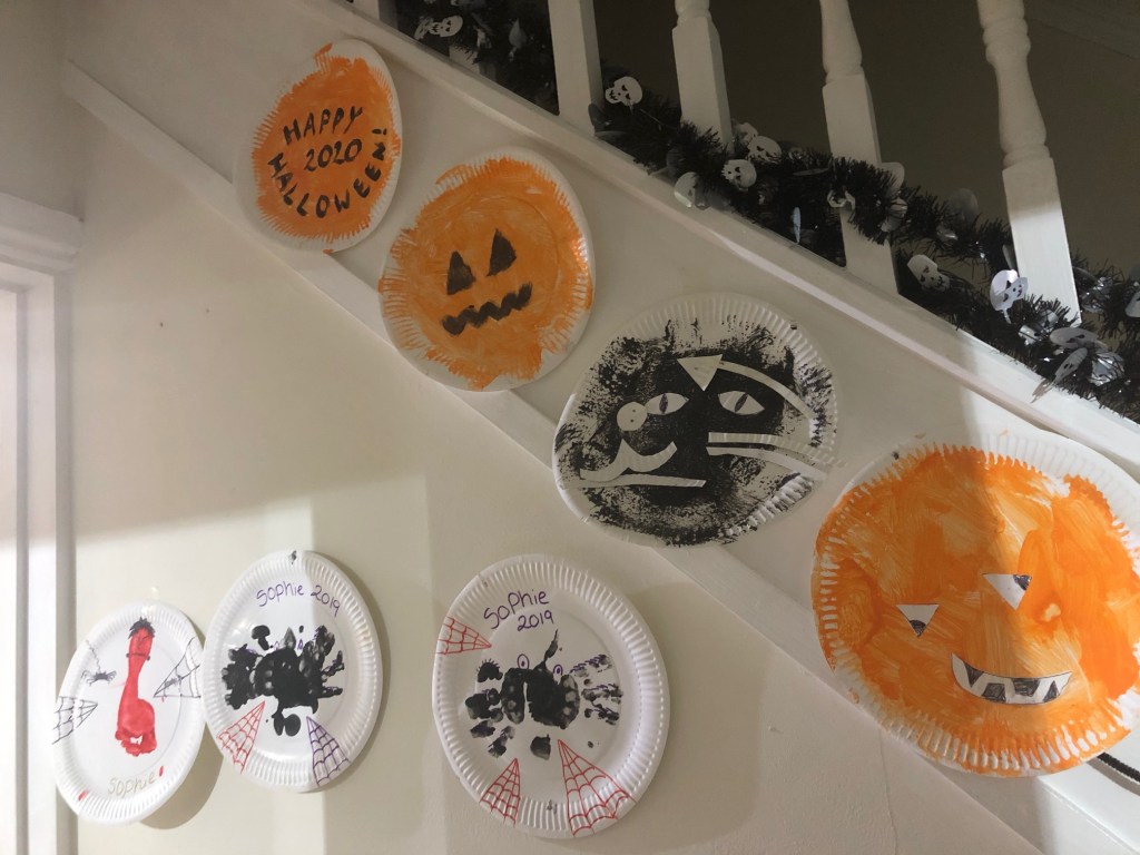 We made one into a spider by sticking pipecleaners on the back of the plate and giving it a face; another became a cat. One of the black plates became a night sky with moon, stars and bats, while the orange plates unsurprisingly became pumpkins. Once they were finished my daughter lined them all up and used them as stepping stones, then they were later fixed along the side of the stairs. My daughter wasn’t very keen on the other Halloween decorations I put up so these were a much more toddler-friendly option!