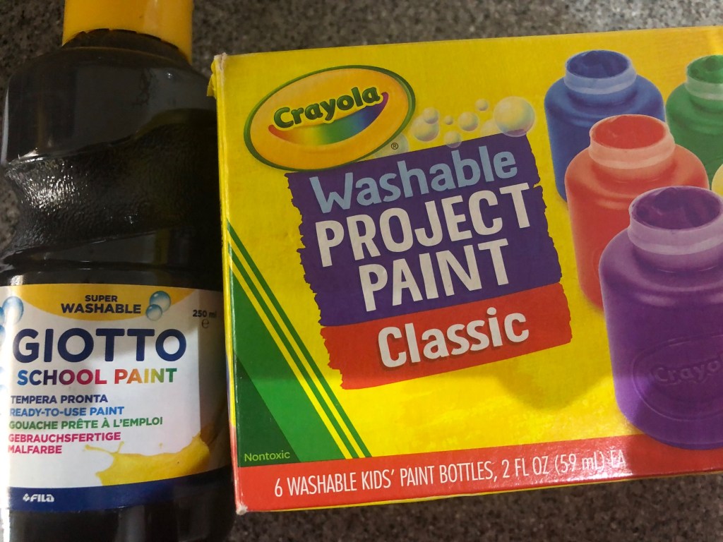 Paint – we used black and orange though you don’t have to be traditional. The paints I used were Giotto school paint in black and the orange from Crayola washable project paint, both from Amazon, which are both suitable for children and are ready to use without needing any mixing.