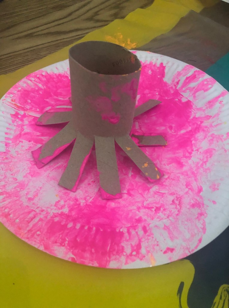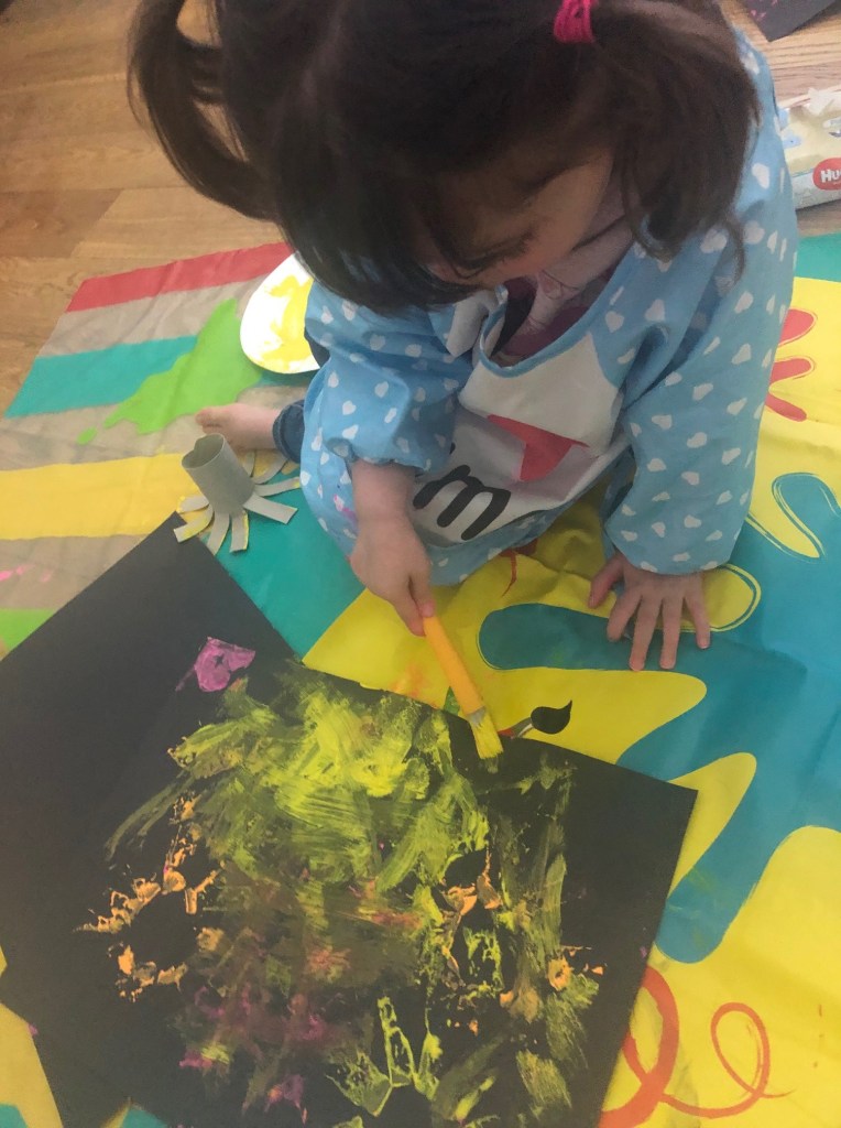 Simply use the cardboard tubes to stamp paint onto the black paper to look like fireworks! My two year old then did some hand painting as well so make sure you have a wet cloth or similar to hand!