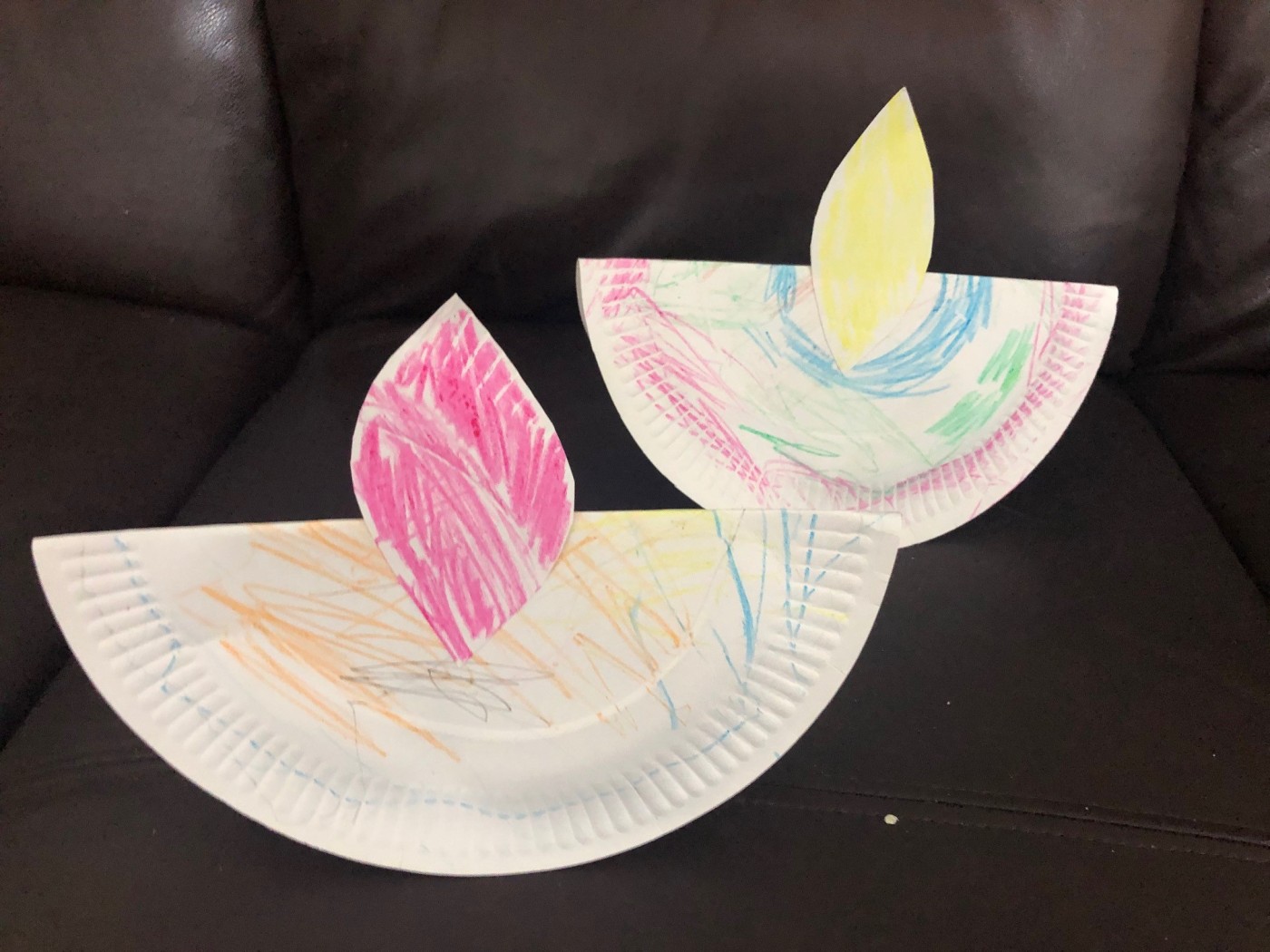 I folded each one in half so they would stand up, and added a flame shape cut out of cardboard (glued on to the back of each plate), which we had also coloured in. We stood them on our windowsill – we live at the end of a cul-de-sac so I don’t think many people will see them, but my daughter seemed quite pleased with her handiwork!