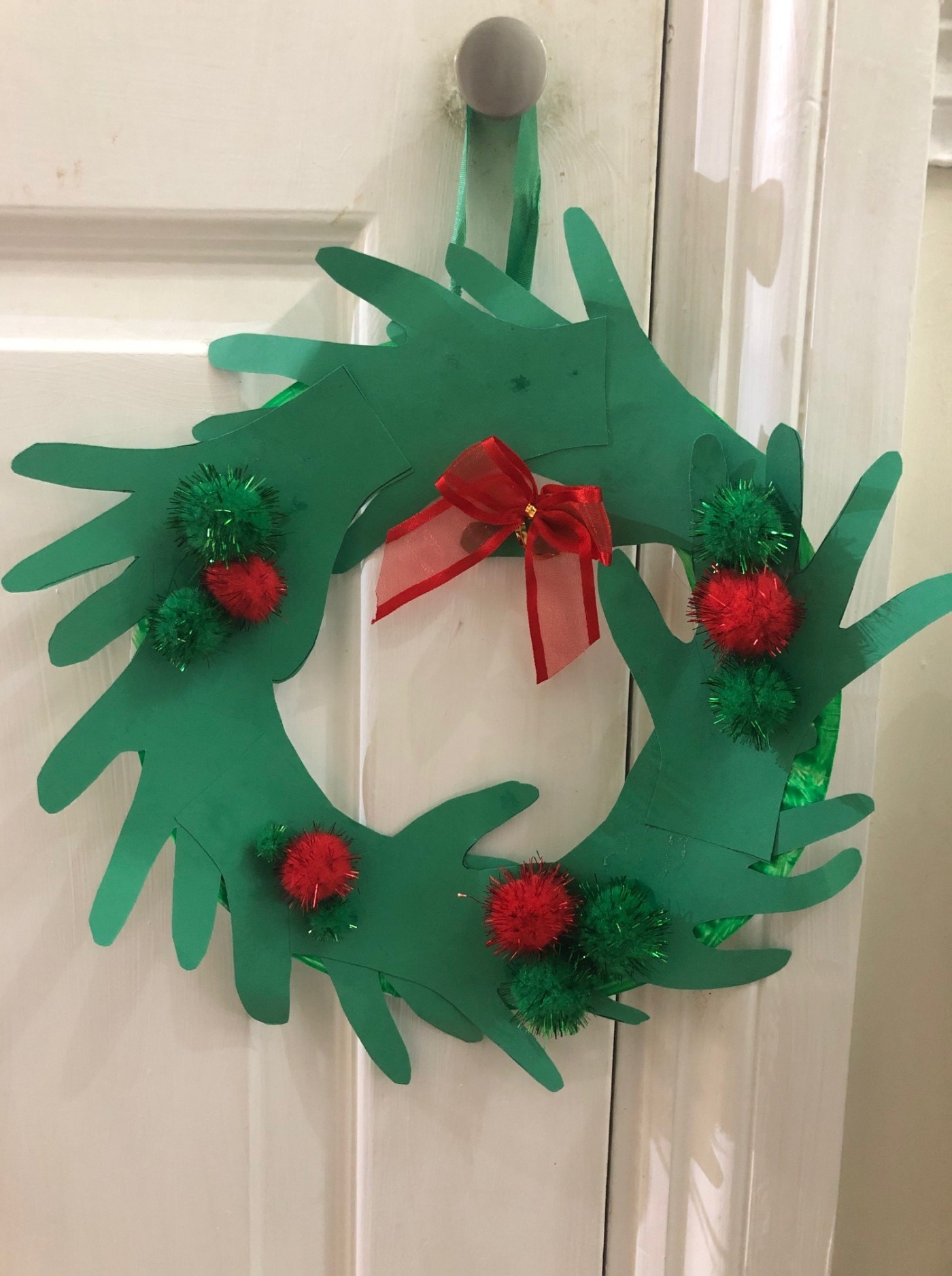 This is a festive wreath made up of hand prints – or rather, hand shapes – decorated with holly pom poms.