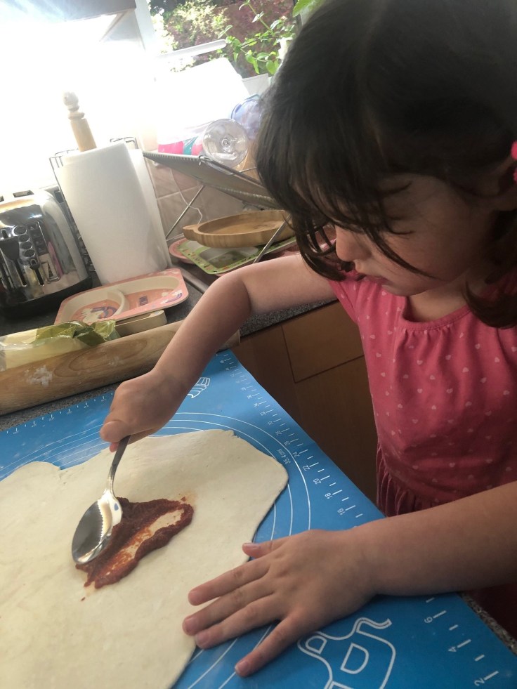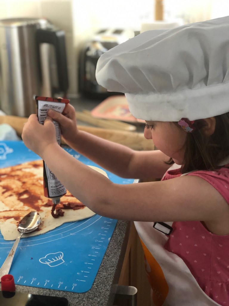 Together we rolled out part of a puff pastry block on a lightly floured surface then she squeezed out some tomato purée and spread it over the puff pastry with the back of a spoon. At that point she decided she needed to be wearing her apron and chef’s hat so while she went to get them I took the opportunity to spread out the purée a bit more evenly and to grate some cheese.