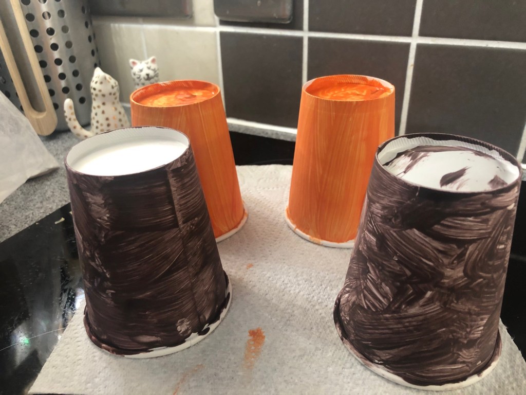 We began by painting four paper cups – you need to use paper ones for this, not plastic. My daughter was easily able to do the painting then we left the cups to dry. She did two brown and two orange.