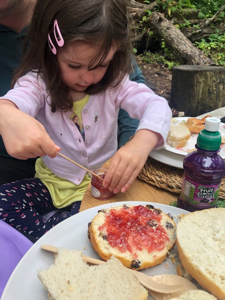 I found a couple of the sandwich fillings a little dry but others were really good especially the BBQ chicken and cheese. I would have preferred more of a cake selection to choose from or even chocolate brownies, as instead the selection was various flavours of doughnuts, tarts, croissants and a chocolate eclair. Each was bite size but just right for our three year old who demolished several of them before my husband and I could get a look in! Finally we each had a scone – one plain and one fruit – and my only complaint would have been we didn’t get enough cream! The food was very nice overall and well packaged in little boxes inside a bigger box with a carrying handle and it was just the thing for our picnic.