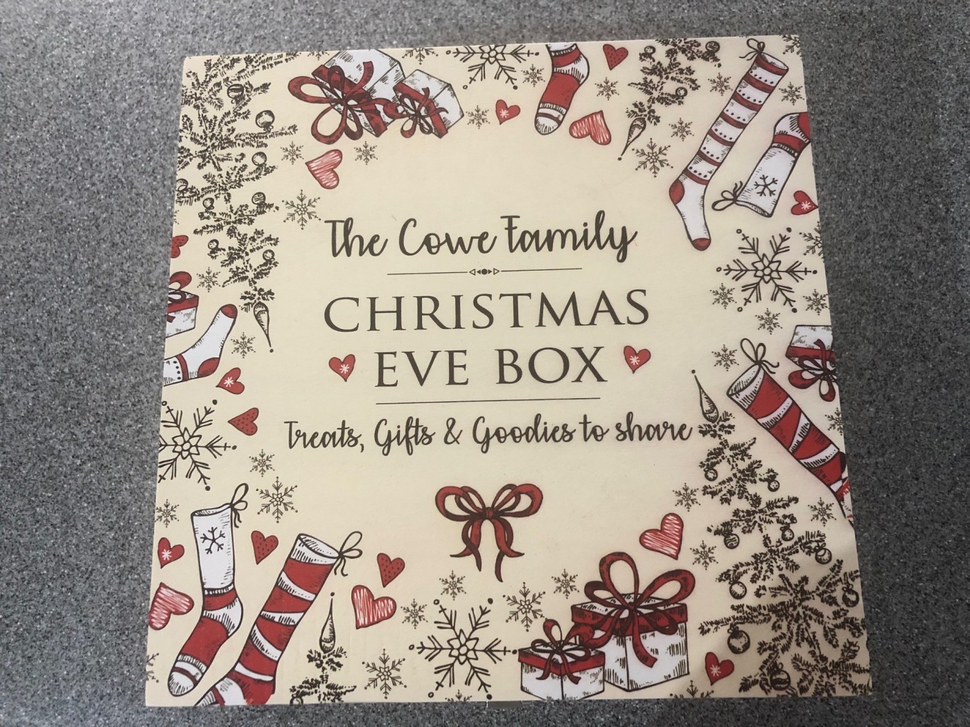 Here’s what is in our Christmas Eve box this year. We have a lovely wooden box with our family name on the top but you can use anything – a decorated crate or shoe box, or you can buy cardboard Christmas Eve boxes very cheaply, and add names with letter stickers if you like.