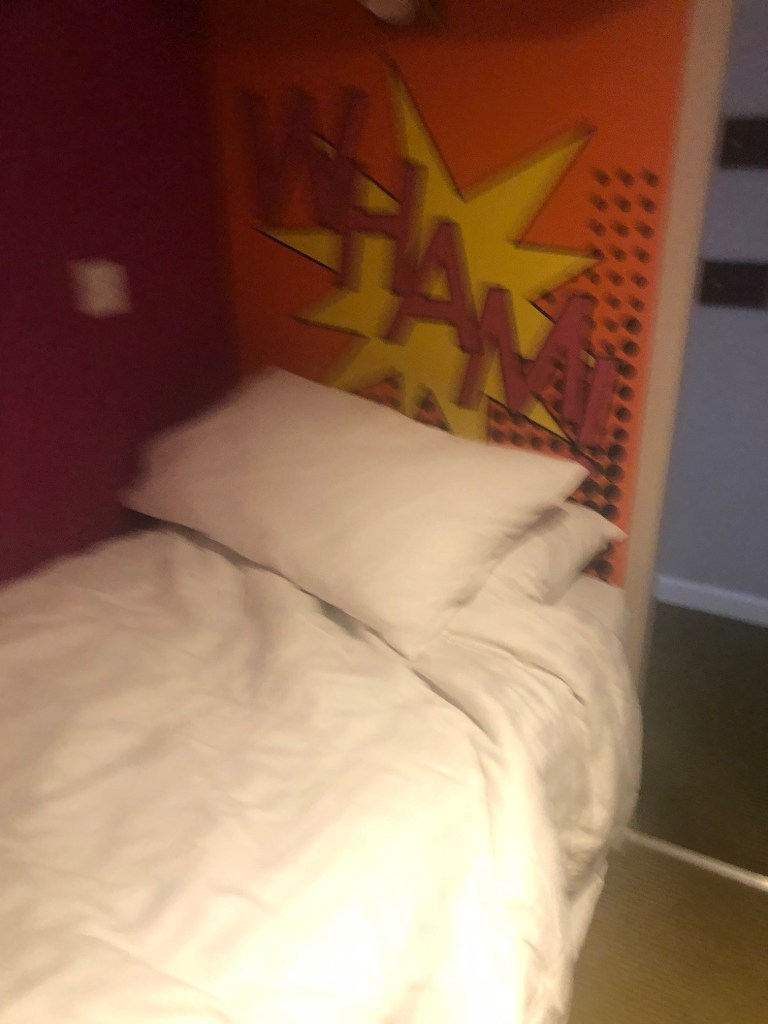 The room itself was quite spacious and modern; we had a living room area with a sofa bed that we used as a sofa, and another chair, plus the double bed. The second bedroom had two small single beds with an open doorway (ie there is no door that you can shut) that was perfect for our daughter. We had brought a bed guard with us (you can also hire them on site subject to availability) which was easy to slip under the mattress to make sure she didn’t fall out, as the beds are a good couple of feet off the ground. Her room also had a little TV facing each bed and some superhero style ‘pow!’ words on the wall.