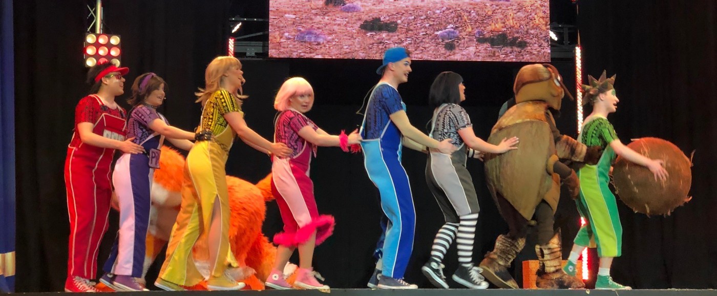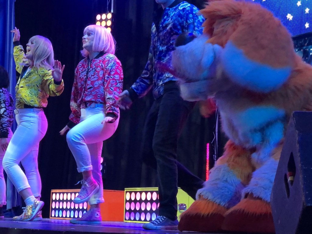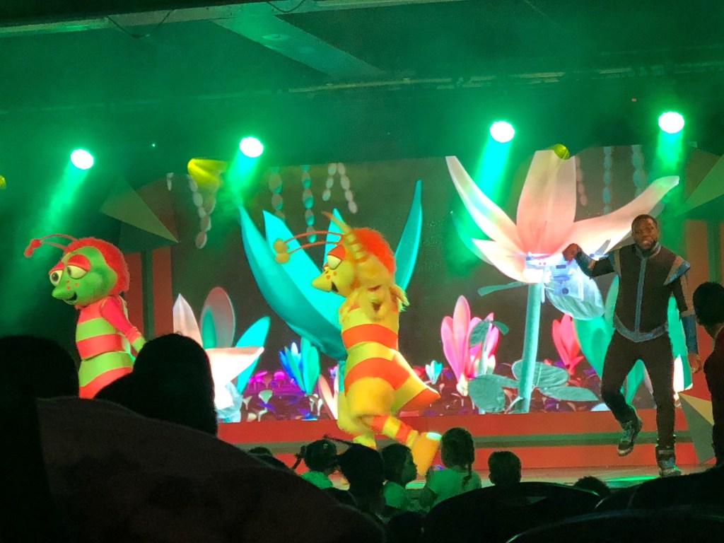 I had never heard of Nathan Connor who is a children’s TV presenter on Channel 5’s Milkshake (and a former Redcoat) and wasn’t sure what to expect from the show. It is set in the future and involves Nathan taking part in an intergalactic dance competition but he has lost parts of his special suit and has to travel to different planets to find it. So he goes to a planet of giant (friendly) bugs – cue people in bee costumes – and an under water world where he interacts with a jelly fish and so on. There is lots of dancing and singing; I thought Nathan was a very good entertainer and it was actually a much better show than seeing Justin Fletcher (though I will always heart Justin).