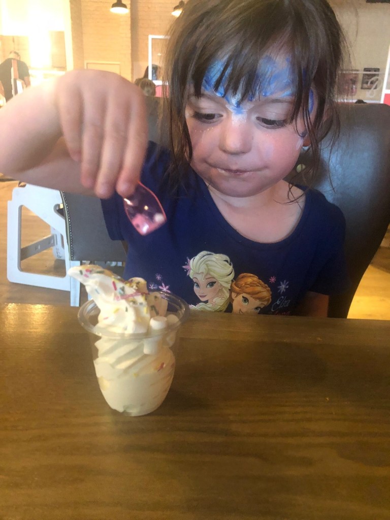 Pizza is the mainstay of Papa John’s but they also have pasta and other dishes on the menu. We ate here on our last break and enjoyed it; this time I decided to go for the buffet option which meant I could help myself to the salad bar and go back as many times for pizza as I wanted. There were five different pizzas on offer so plenty of choice to take a slice of whatever you fancy. Sophie had the ice cream factory dessert which wasn’t working the last time we were here; you dispense a portion of soft scoop vanilla ice cream into a small cup and then add sprinkles, mini marshmallows etc yourself.