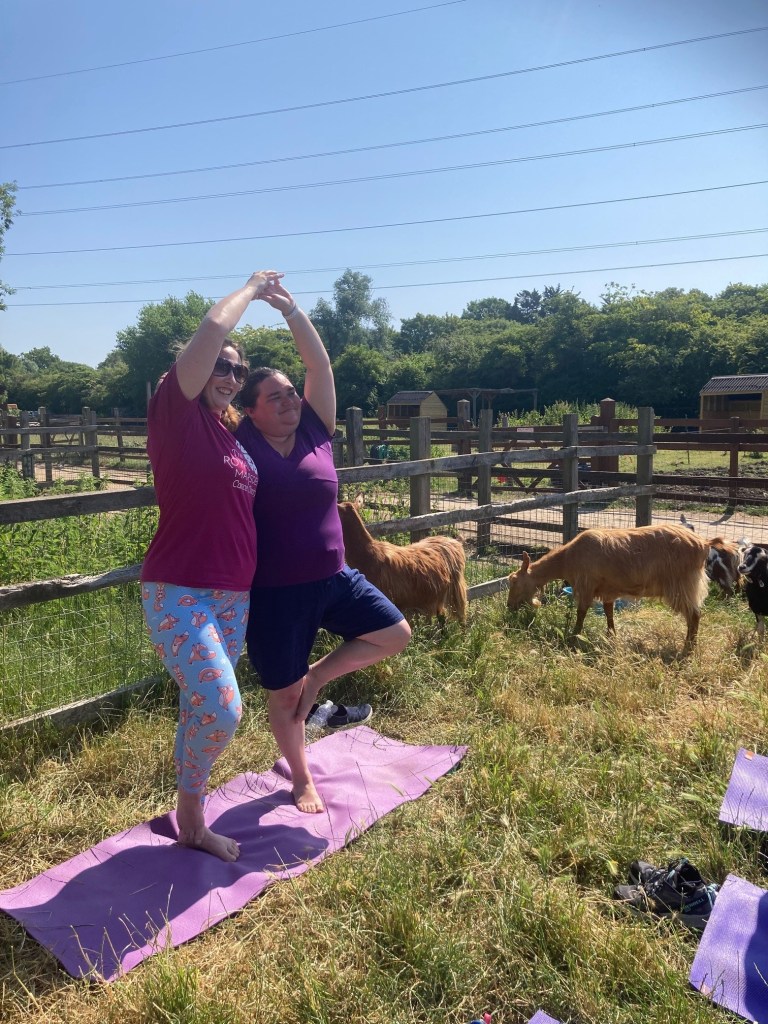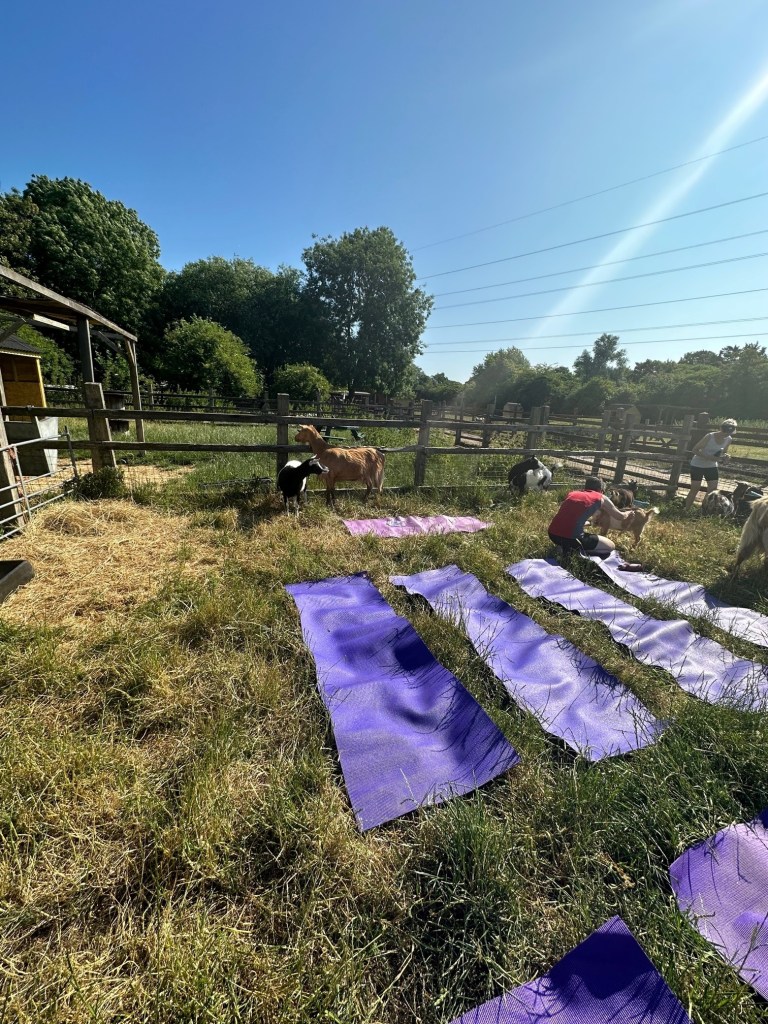The Goga Yoga Studio runs small classes in London and Norfolk and I took part at Deen City Farm – not realising we would be in the goats’ regular enclosure being watched by some bemused families visiting the farm!