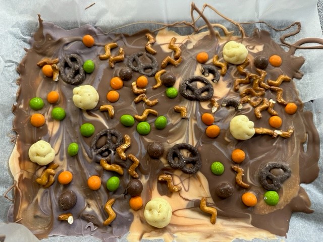 I also made some Halloween chocolate bark – it’s a good way to use up any leftover candy after trick or treating! You can read how I made it on my other blog, Caroline Makes.