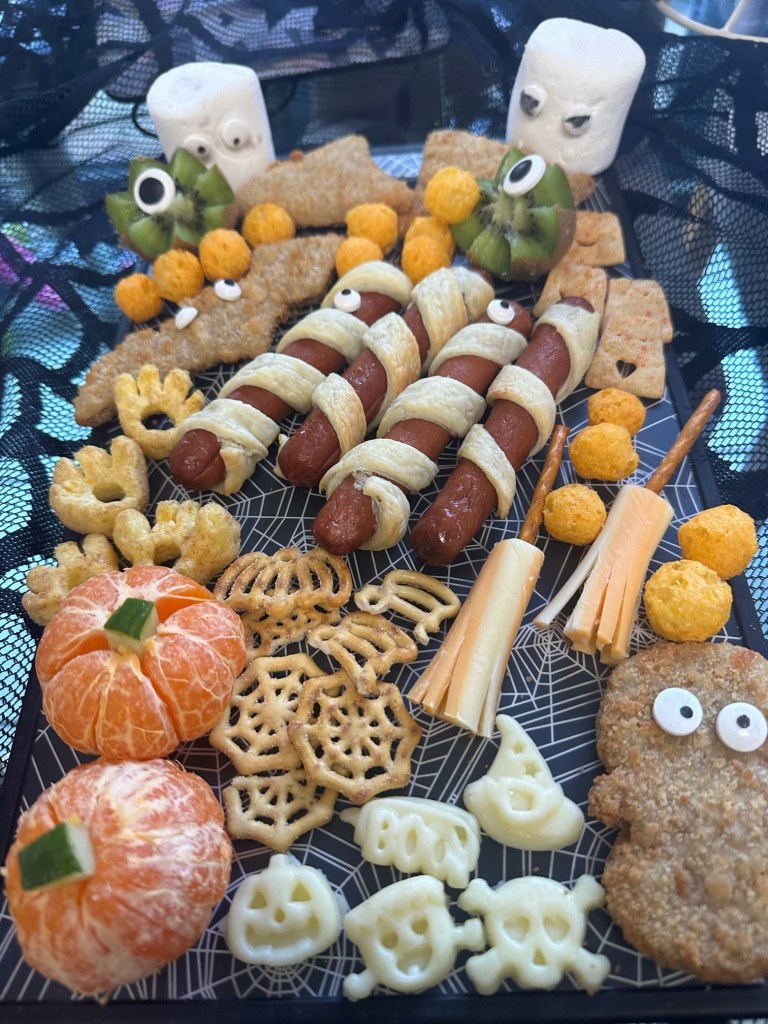 Some additional things in the picture above, that I didn’t do last time, are Halloween shaped breaded turkey pieces from Iceland, to which I added edible eyes (by Cake Decor which you can find in supermarkets), some mini cheese shapes by Strings & Things, some cobweb shaped pretzels from M&S, Monster Munch crisps and my favourite new idea – witches’ broomsticks. These are made from long pretzel sticks, which I found in M&S, and half a Cheese String on the bottom!