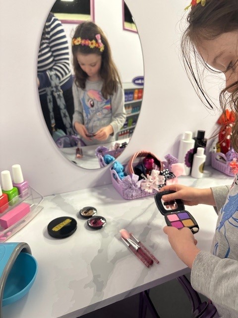 We also particularly liked the beauty salon, with a phone and appointment calendar, a counter with seats in front of a mirror and a range of props including hairdressing scissors, hair straighteners, various sprays and lotions, make up (pretend) with real make-up brushes and two baskets of hair accessories. There’s a sign giving a gentle reminder that adults should not sit in the chairs, and that anything belonging to Little Street should be left behind when you leave, but otherwise you are free to role play however you like.