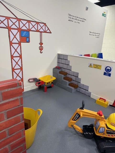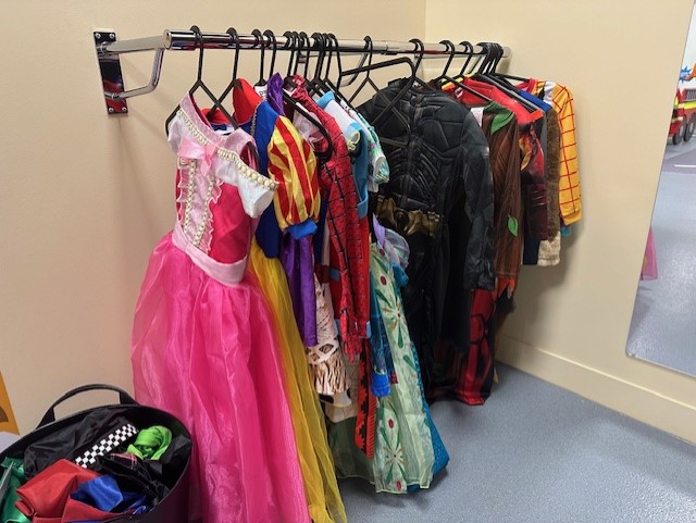 The central area has a stationery fire engine to climb in, complete with fire fighter’s uniform and equipment, with a little road around it where children can circle around on ride-on cars (watch your feet!). There’s a picnic area with a play barbecue, loads of food and even some cuddly squirrels and a construction zone where you can don a high-vis jacket and build with bricks. The theatre area has a rail of good quality dressing up costumes ranging from Moana, Frozen’s Anna and Mirabel from Encanto to Chase from Paw Patrol, Iron Man and a unicorn onesie, and a stage to give your best performance.
