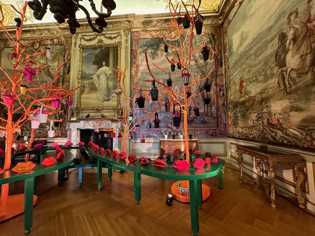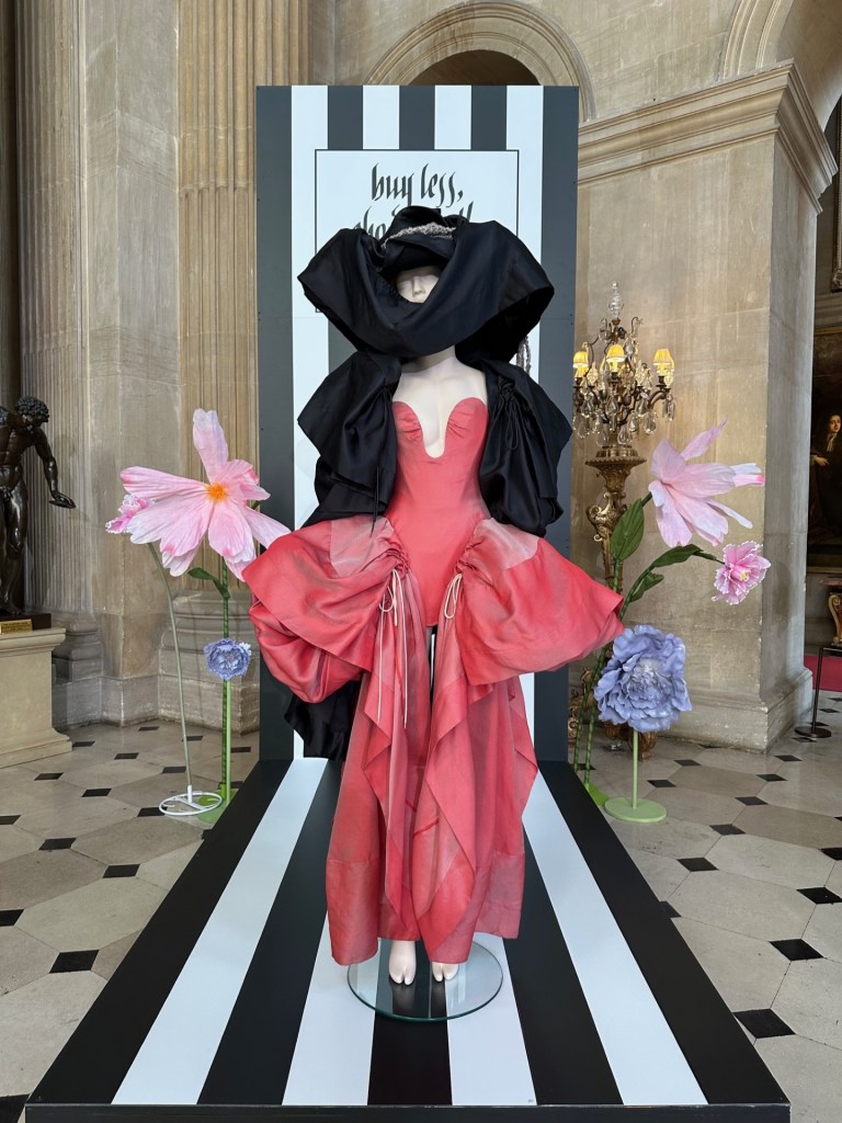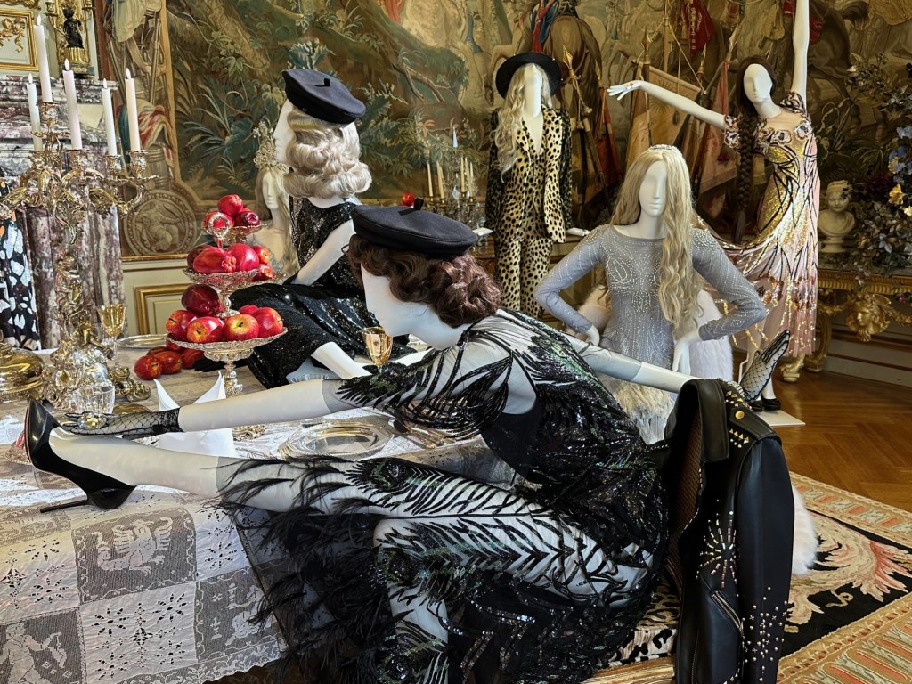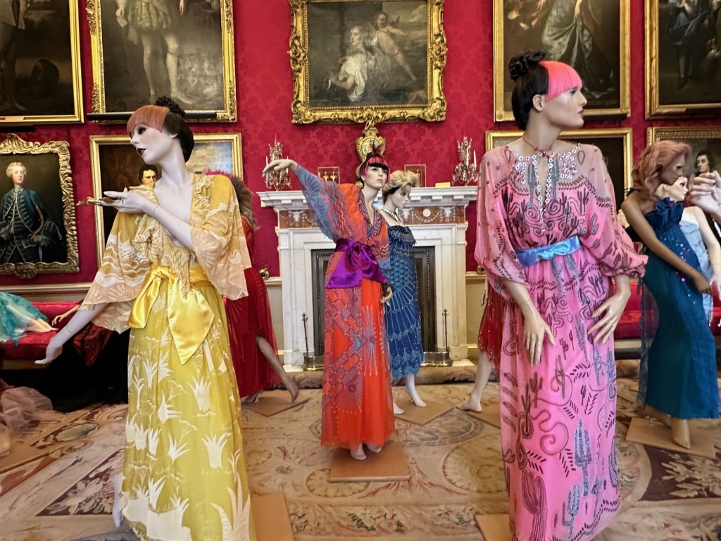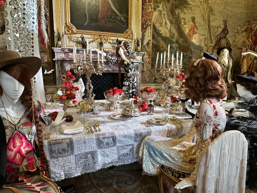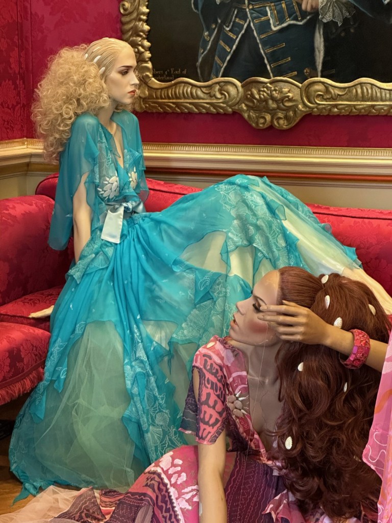 I went to Blenheim Palace for the first time this Easter holiday with my husband and six year old; we had gone mainly for the adventure playground and house itself and I hadn’t even realised the fashion exhibition was in the main house and not something that you pay extra for. As you walk around the palace – home to the 12th Duke of Marlborough and birthplace of Sir Winston Churchill – you will see the works of 12 British fashion designers, starting with Vivienne Westwood and including Stella McCartney, Lulu Guinness, Bruce Oldfield, Temperley and more. There are rows of mannequins, others standing alone in front of a statue or bay window, but the ones I liked most were arranged as if they were dancing at a party or enjoying a dinner party, kicking back (literally) with a drink. The juxtaposition of the brightly coloured dresses with the gilt and ornate paintings and historic furniture is a joyful storytelling of the importance of British fashion through the ages.