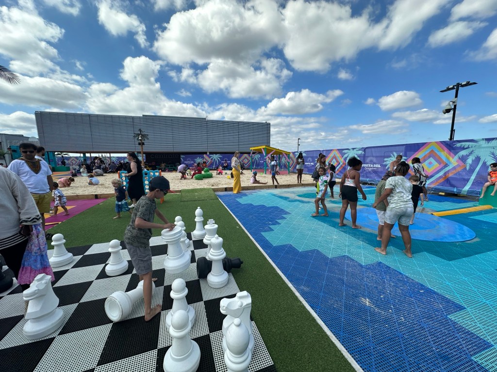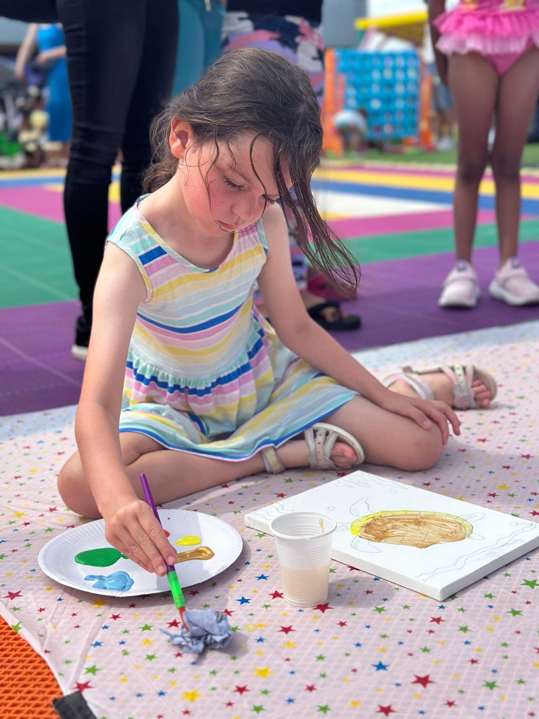 There was a giant Connect 4 game and chess set as well as a giant deckchair and photo board to pose in; and every day there is a different activity taking place. On Sunday there was a painting session with Pop N Paint where each child was given a small canvas with a pencil drawing already sketched out – either a seahorse, sea turtle or octopus, and a paint pallet. Only about six children could take part at a time so we waited a few minutes until a spot on the mat was free; my daughter really enjoyed painting her sea turtle which was then placed on the roof of one of the huts to dry for us to pick up before we left.