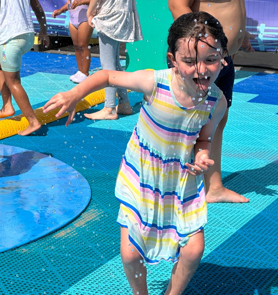 The water in the splash pad runs for 10 minutes, then is turned off for 20 minutes, on a rolling basis – “you’re not paying the water bill,” one member of staff quipped. It’s a flat floor (with mats) and various water spouts which my six year old loved to run around and play in. The huge sandpit was great as well – deep enough to properly dig and make sandcastles, with a large green caterpillar in the middle to sit on, and benches under cover at one end (also a hammock according to photos I’ve seen but I didn’t notice that). It’s advisable to bring your own bucket and spade, and of course a towel and change of clothes! There is a block of toilets and also some small changing huts but they are open at the front with no doors – so don’t give a huge amount of privacy.